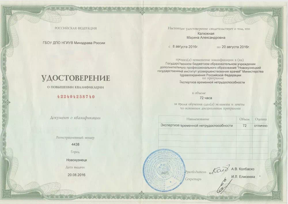 • 2016 — Новокузнецкий государственный институт усовершенствования врачей (Повышение квалификации по программе "Экспертиза временной нетрудоспособности").